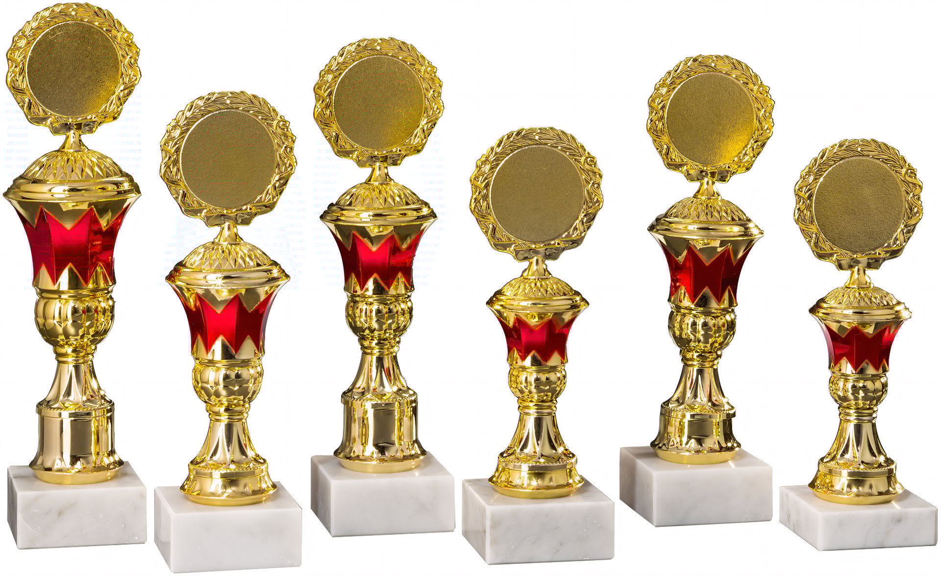 Pokal in Gold, Rot von 19,7 cm – 26,5 cm Höhe in Standard Qualität. Individuelle Sockelbeschriftung auf Gravurplatte. Emblem in 50 mm Durchmesser wählbar aus über 300 Designs oder einem eigenen Emblem. Dieser Pokal ist universell für jede Zielgruppe/Sportart einsetzbar. Als 6er-Serie erhältlich.