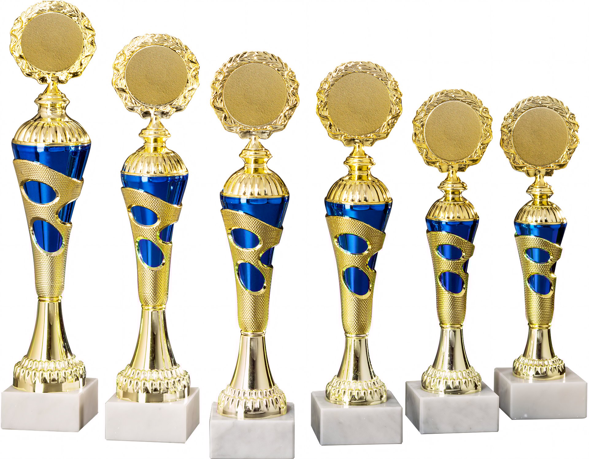 Pokal in Gold, Blau von 25,5 cm – 33,4 cm Höhe in Standard Qualität. Individuelle Sockelbeschriftung auf Gravurplatte. Emblem in 50 mm Durchmesser wählbar aus über 300 Designs oder einem eigenen Emblem. Dieser Pokal ist universell für jede Zielgruppe/Sportart einsetzbar. Als 6er-Serie erhältlich.
