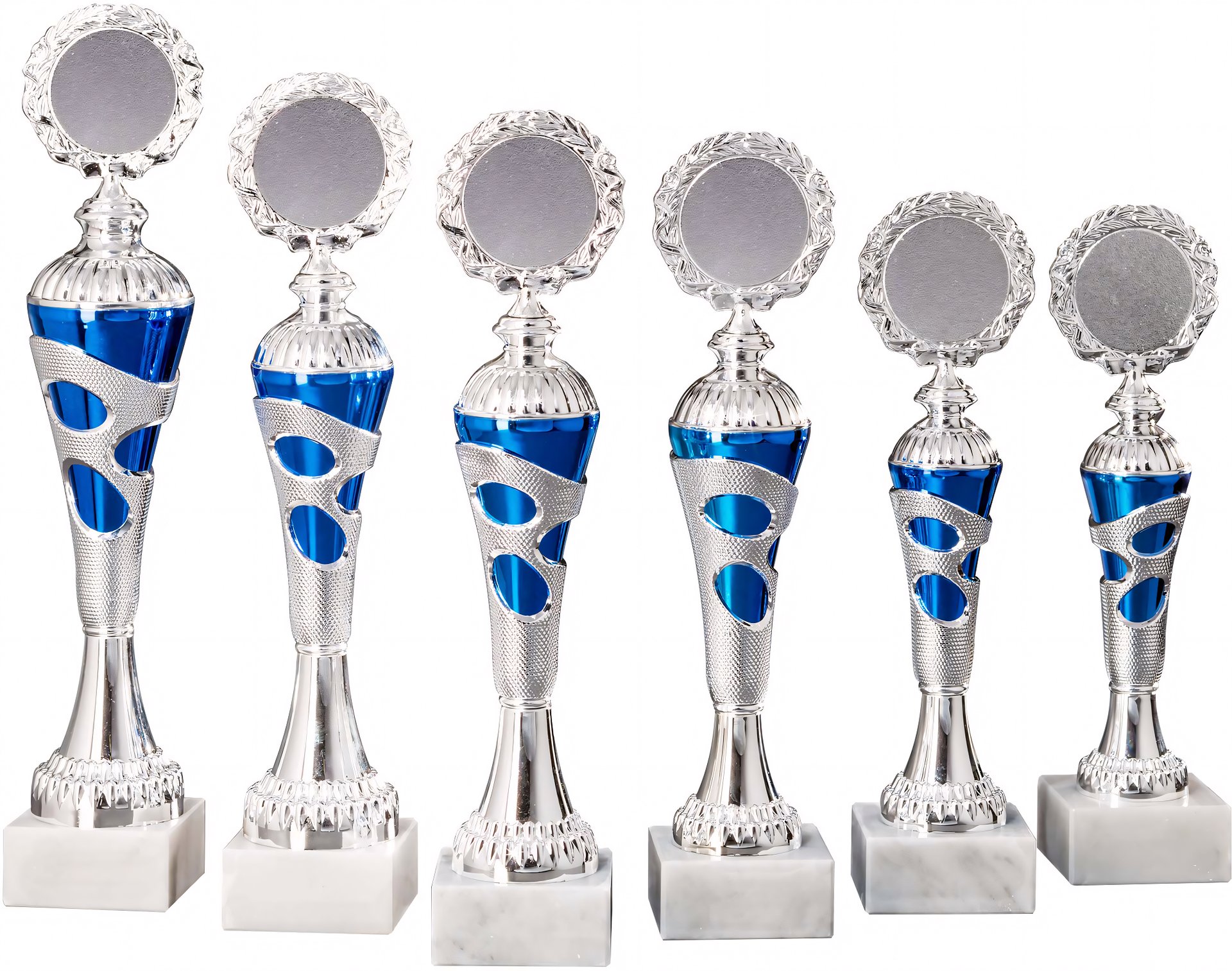 Pokal in Silber, Blau von 25,5 cm – 33,4 cm Höhe in Standard Qualität. Individuelle Sockelbeschriftung auf Gravurplatte. Emblem in 50 mm Durchmesser wählbar aus über 300 Designs oder einem eigenen Emblem. Dieser Pokal ist universell für jede Zielgruppe/Sportart einsetzbar. Als 6er-Serie erhältlich.