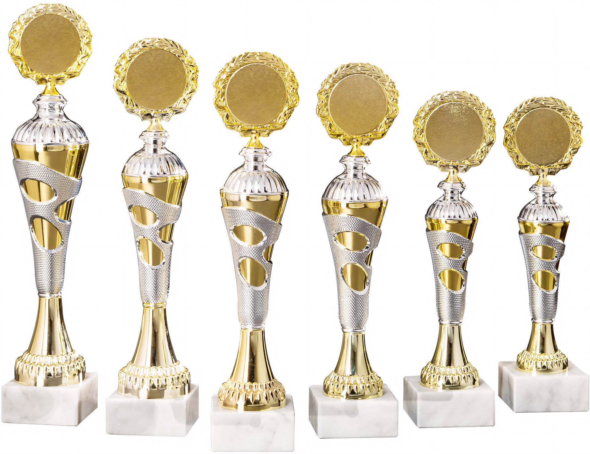 Pokal in Silber, Gold von 25,5 cm – 33,4 cm Höhe in Standard Qualität. Individuelle Sockelbeschriftung auf Gravurplatte. Emblem in 50 mm Durchmesser wählbar aus über 300 Designs oder einem eigenen Emblem. Dieser Pokal ist universell für jede Zielgruppe/Sportart einsetzbar. Als 6er-Serie erhältlich.