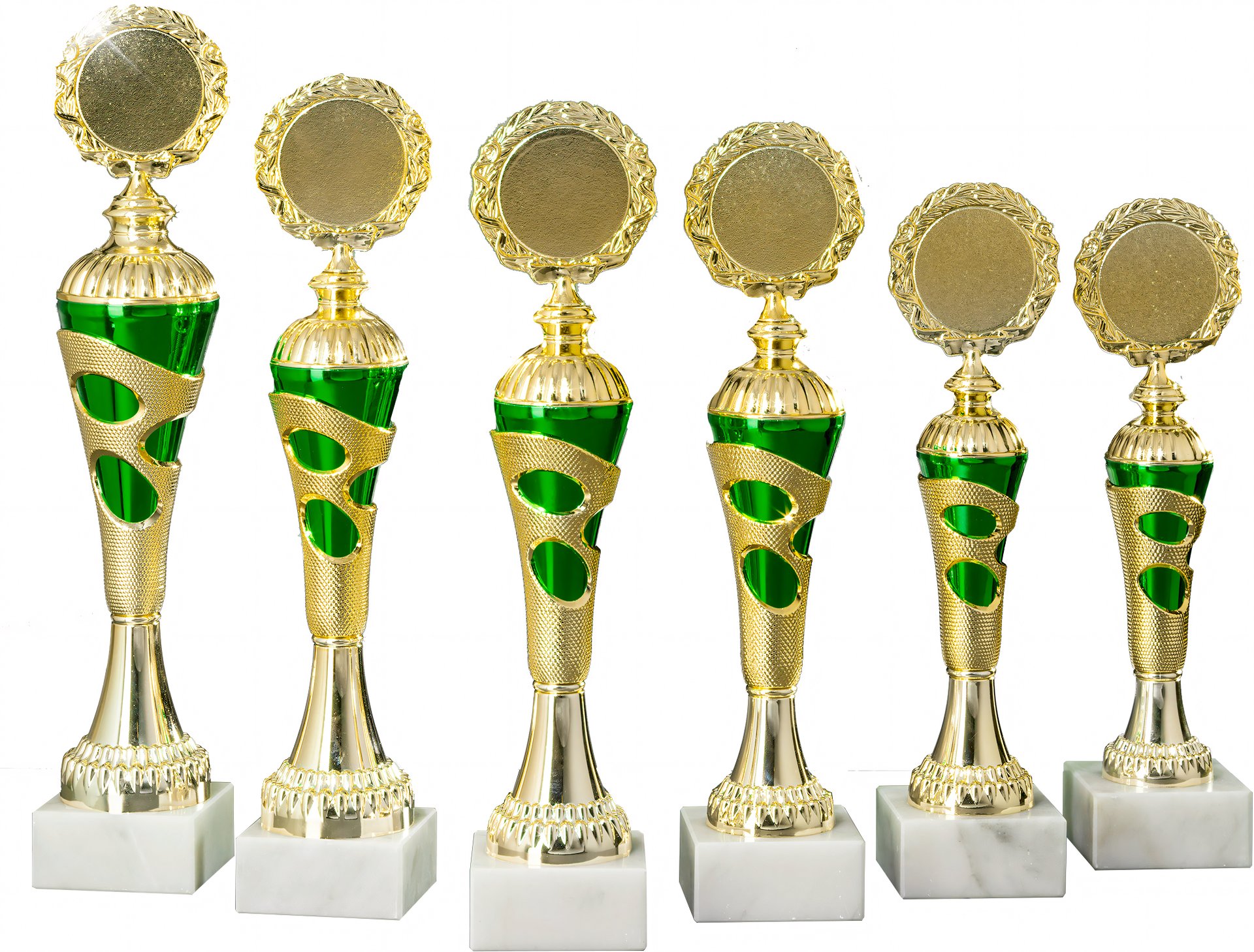 Pokal in Gold, Grün von 25,5 cm – 33,4 cm Höhe in Standard Qualität. Individuelle Sockelbeschriftung auf Gravurplatte. Emblem in 50 mm Durchmesser wählbar aus über 300 Designs oder einem eigenen Emblem. Dieser Pokal ist universell für jede Zielgruppe/Sportart einsetzbar. Als 6er-Serie erhältlich.