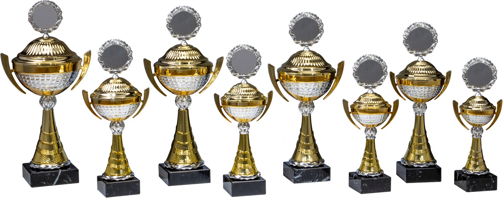 Pokal in Gold, Silber von 26,2 cm – 37,5 cm Höhe in Standard Qualität. Individuelle Sockelbeschriftung auf Gravurplatte. Emblem in 50 mm Durchmesser wählbar aus über 300 Designs oder einem eigenen Emblem. Dieser Pokal ist universell für jede Zielgruppe/Sportart einsetzbar. Als 8er-Serie erhältlich.