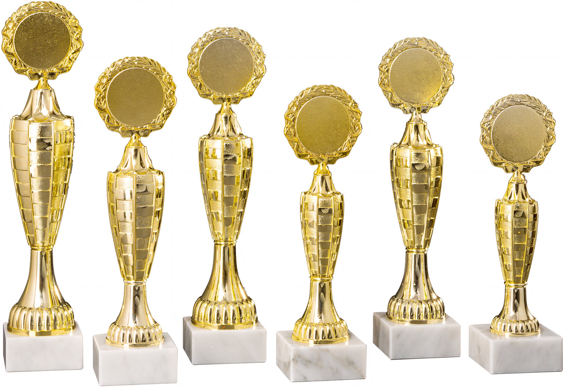 Pokal in Gold von 23,3 cm – 31 cm Höhe in Standard Qualität. Individuelle Sockelbeschriftung auf Gravurplatte. Emblem in 50 mm Durchmesser wählbar aus über 300 Designs oder einem eigenen Emblem. Dieser Pokal ist universell für jede Zielgruppe/Sportart einsetzbar. Als 6er-Serie erhältlich.