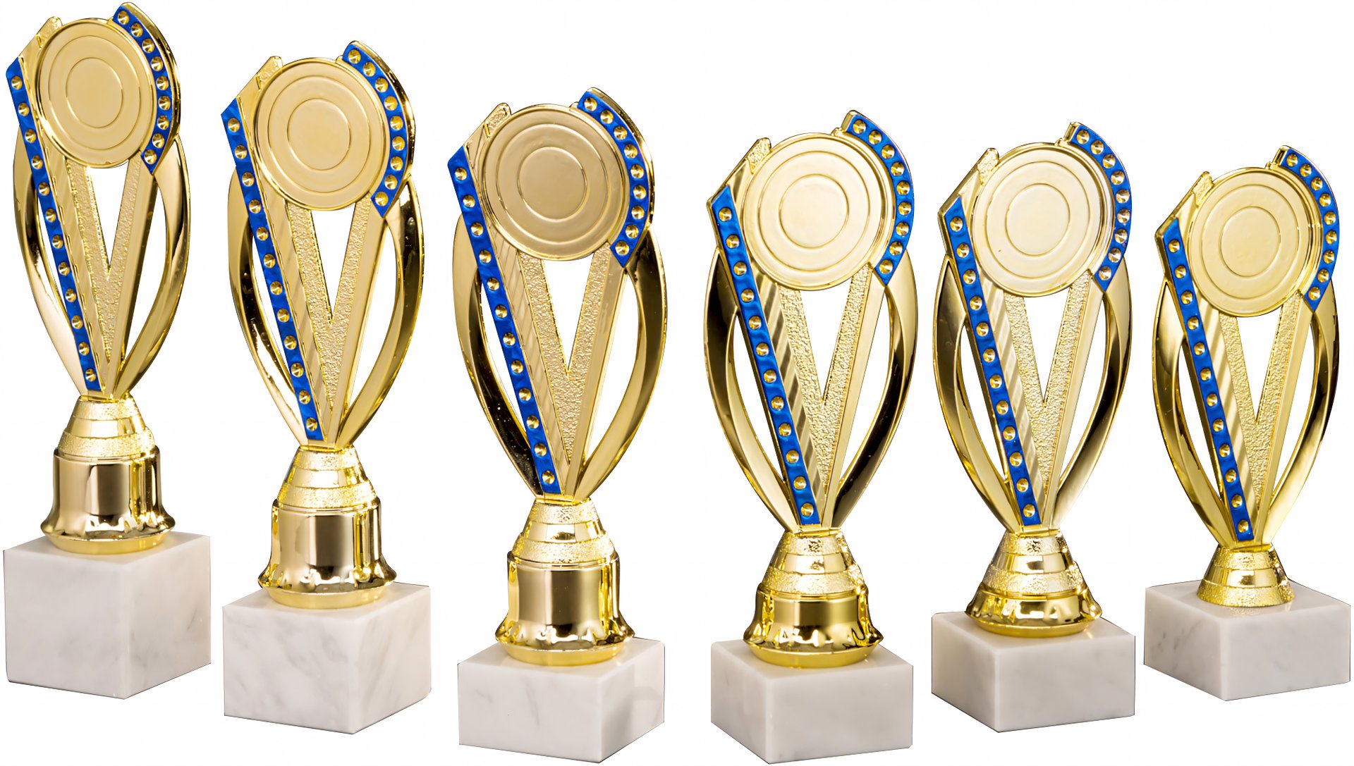 Pokal in Gold, Blau von 19,5 cm – 25,1 cm Höhe in Standard Qualität. Individuelle Sockelbeschriftung auf Gravurplatte. Emblem in 50 mm Durchmesser wählbar aus über 300 Designs oder einem eigenen Emblem. Dieser Pokal ist universell für jede Zielgruppe/Sportart einsetzbar. Als 6er-Serie erhältlich.