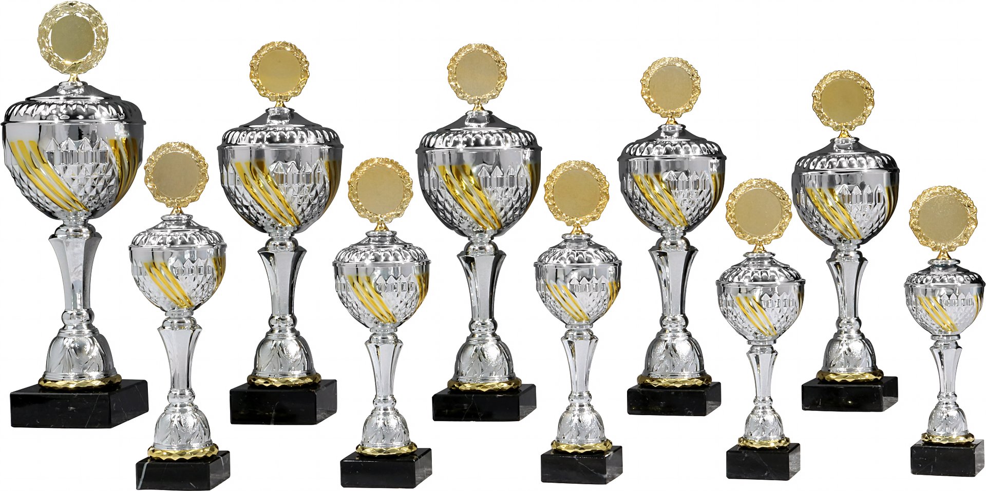 Pokal in Silber, Gold von 29,5 cm – 48 cm Höhe in Standard Qualität. Individuelle Sockelbeschriftung auf Gravurplatte. Emblem in 50 mm Durchmesser wählbar aus über 300 Designs oder einem eigenen Emblem. Dieser Pokal ist universell für jede Zielgruppe/Sportart einsetzbar. Als 10er-Serie erhältlich.