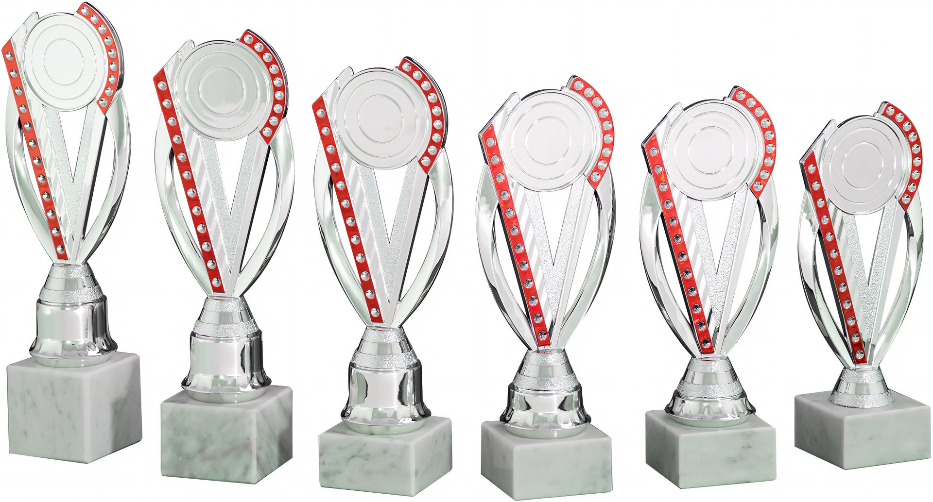 Pokal in Silber, Rot von 19,5 cm – 25,1 cm Höhe in Standard Qualität. Individuelle Sockelbeschriftung auf Gravurplatte. Emblem in 50 mm Durchmesser wählbar aus über 300 Designs oder einem eigenen Emblem. Dieser Pokal ist universell für jede Zielgruppe/Sportart einsetzbar. Als 6er-Serie erhältlich.
