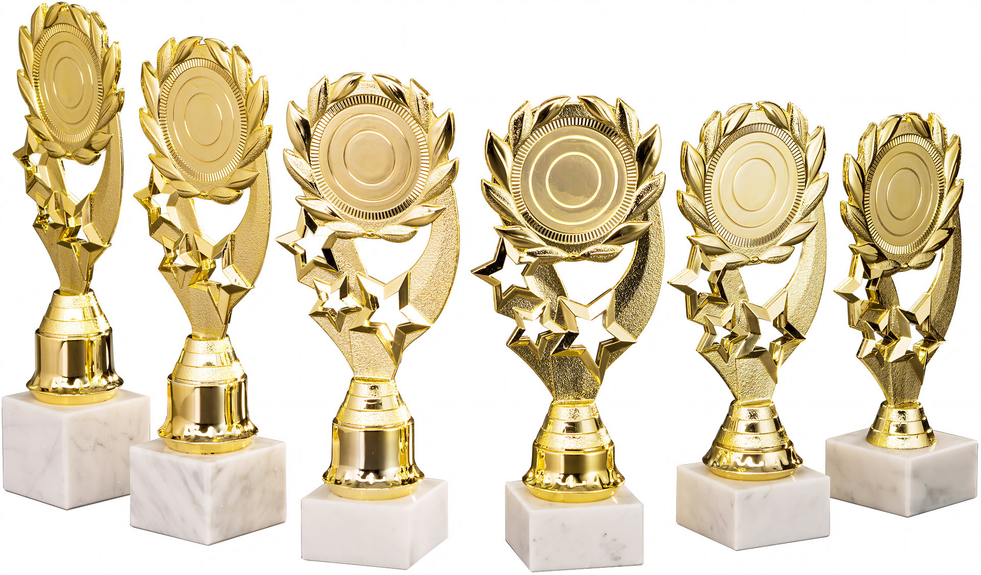Pokal in Gold von 19,5 cm – 25,1 cm Höhe in Standard Qualität. Individuelle Sockelbeschriftung auf Gravurplatte. Emblem in 50 mm Durchmesser wählbar aus über 300 Designs oder einem eigenen Emblem. Dieser Pokal ist universell für jede Zielgruppe/Sportart einsetzbar. Als 6er-Serie erhältlich.