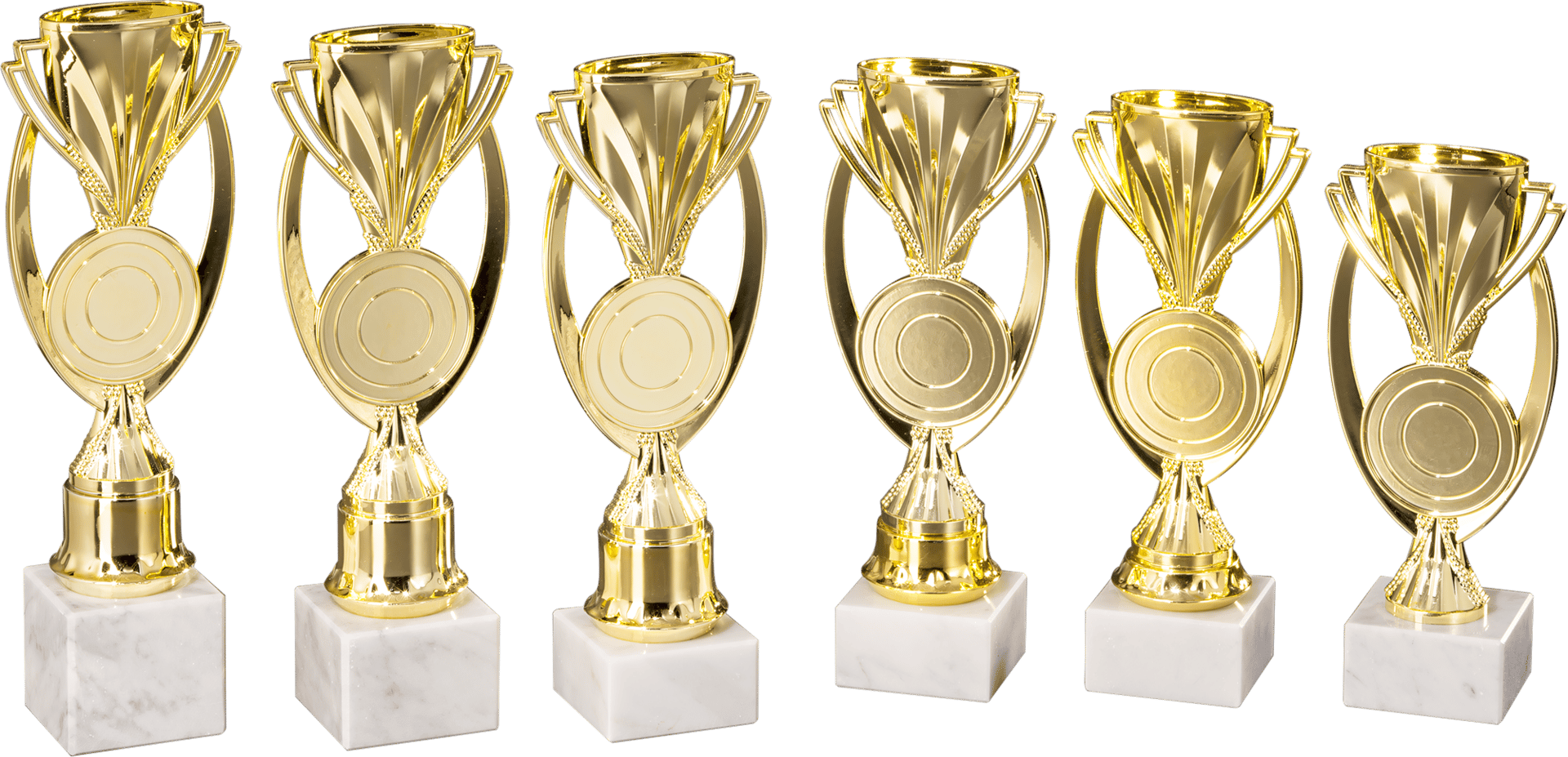 Pokal in Gold von 19,5 cm – 25,1 cm Höhe in Standard Qualität. Individuelle Sockelbeschriftung auf Gravurplatte. Emblem in 50 mm Durchmesser wählbar aus über 300 Designs oder einem eigenen Emblem. Dieser Pokal ist universell für jede Zielgruppe/Sportart einsetzbar. Als 6er-Serie erhältlich.