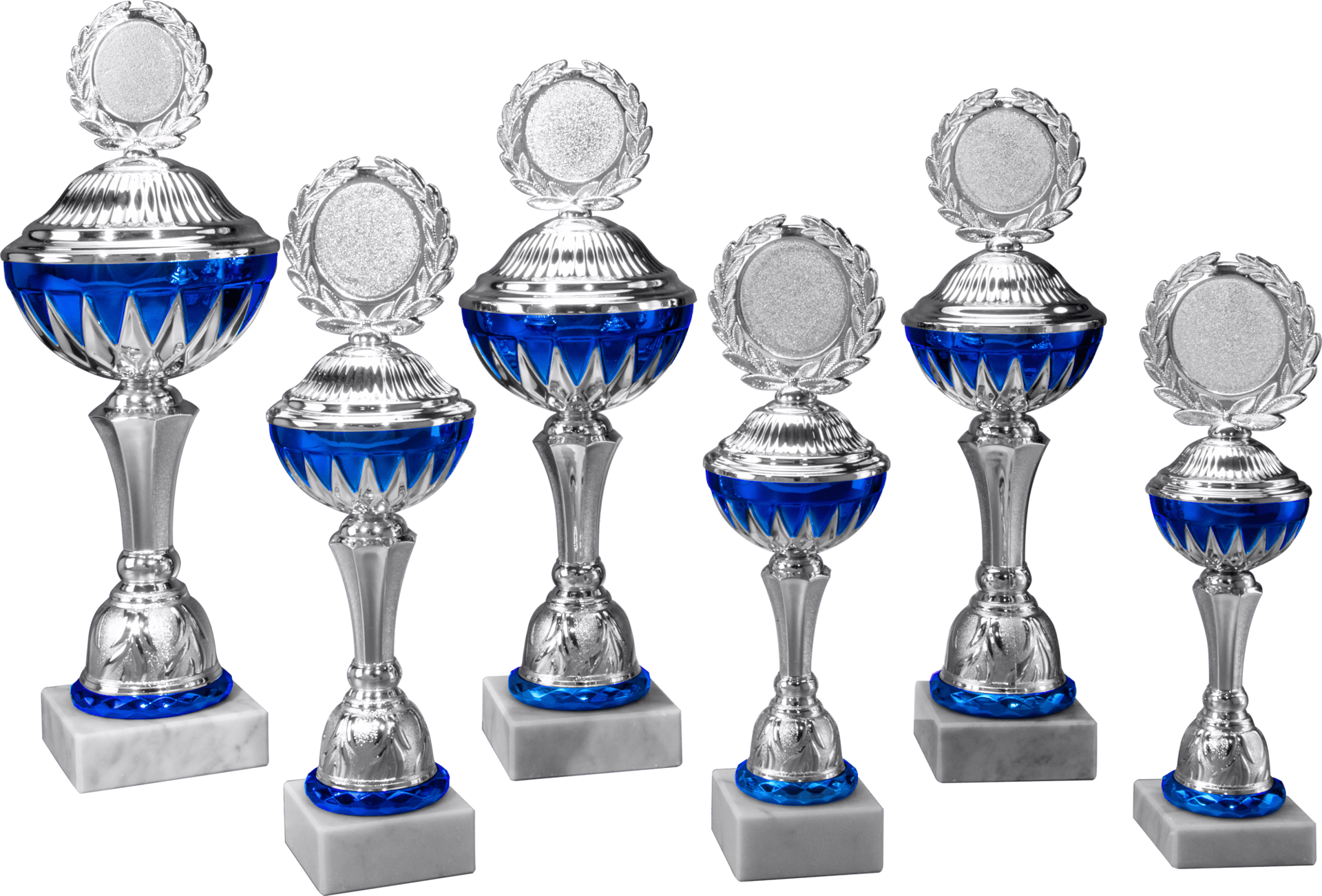 Pokal in Silber, Blau von 26,5 cm – 39,5 cm Höhe in Standard Qualität. Individuelle Sockelbeschriftung auf Gravurplatte. Emblem in 50 mm Durchmesser wählbar aus über 300 Designs oder einem eigenen Emblem. Dieser Pokal ist universell für jede Zielgruppe/Sportart einsetzbar. Als 6er-Serie erhältlich.