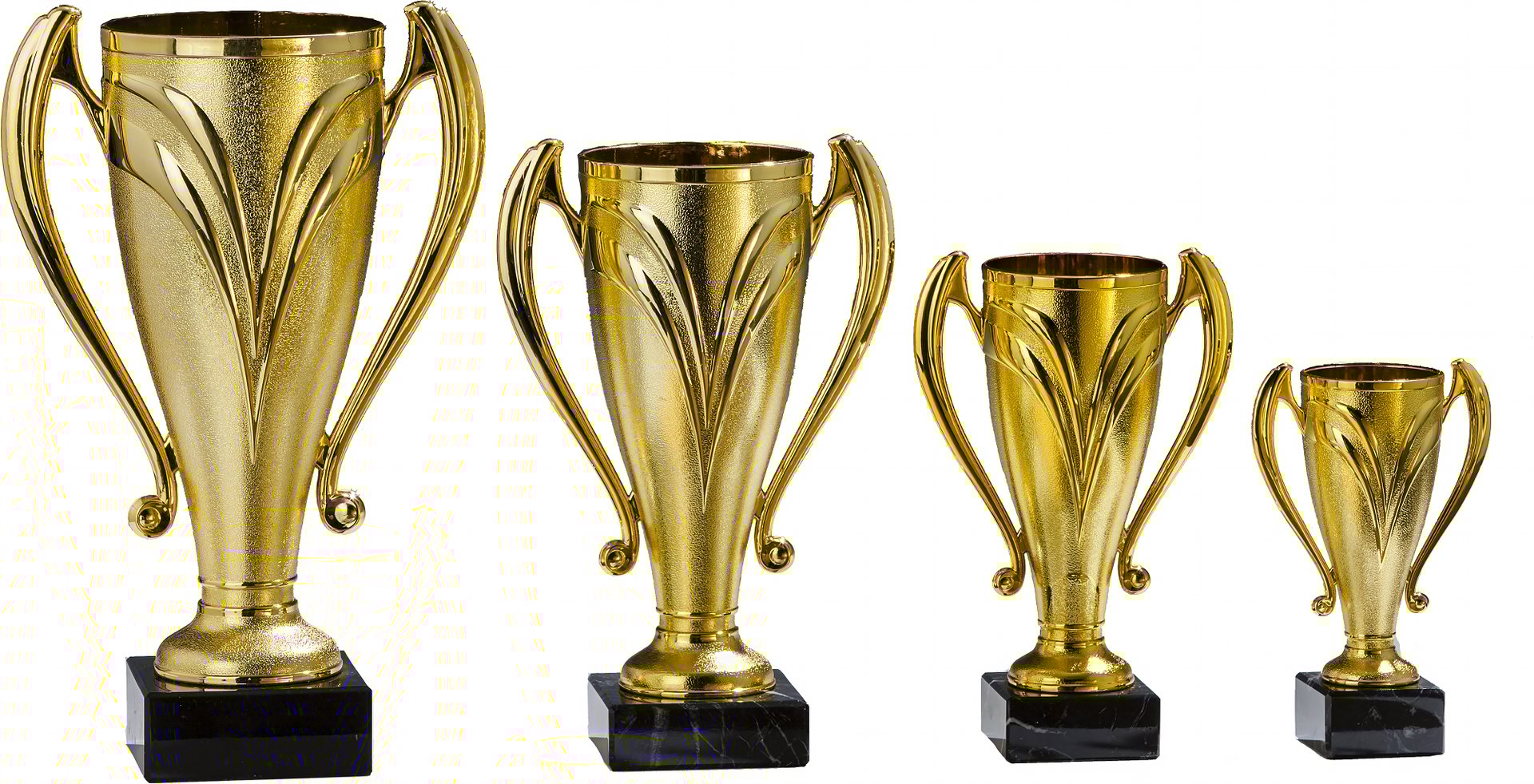 Pokal in Gold von 17 cm – 33 cm Höhe in Standard Qualität. Individuelle Sockelbeschriftung auf Gravurplatte. Dieser Pokal ist universell für jede Zielgruppe/Sportart einsetzbar. Als 4er-Serie erhältlich.