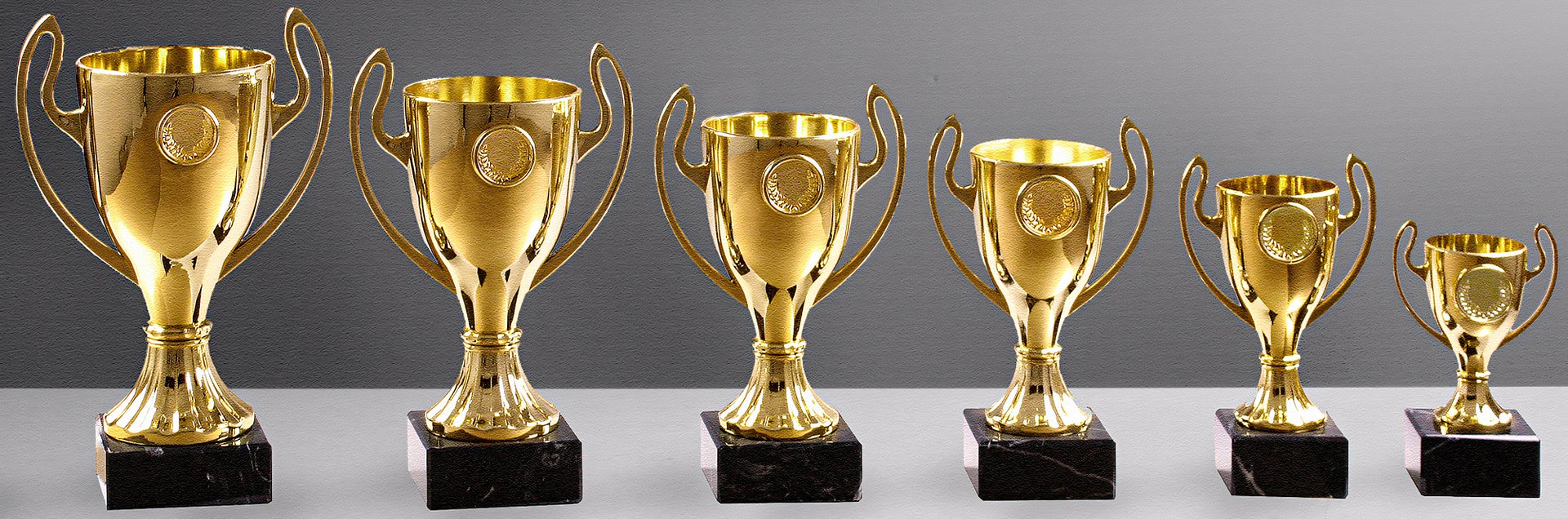 Pokal in Gold von 13 cm – 23,7 cm Höhe in Standard Qualität. Individuelle Sockelbeschriftung auf Gravurplatte. Emblem in 25 mm Durchmesser wählbar aus über 300 Designs oder einem eigenen Emblem. Dieser Pokal ist universell für jede Zielgruppe/Sportart einsetzbar. Als 6er-Serie erhältlich.