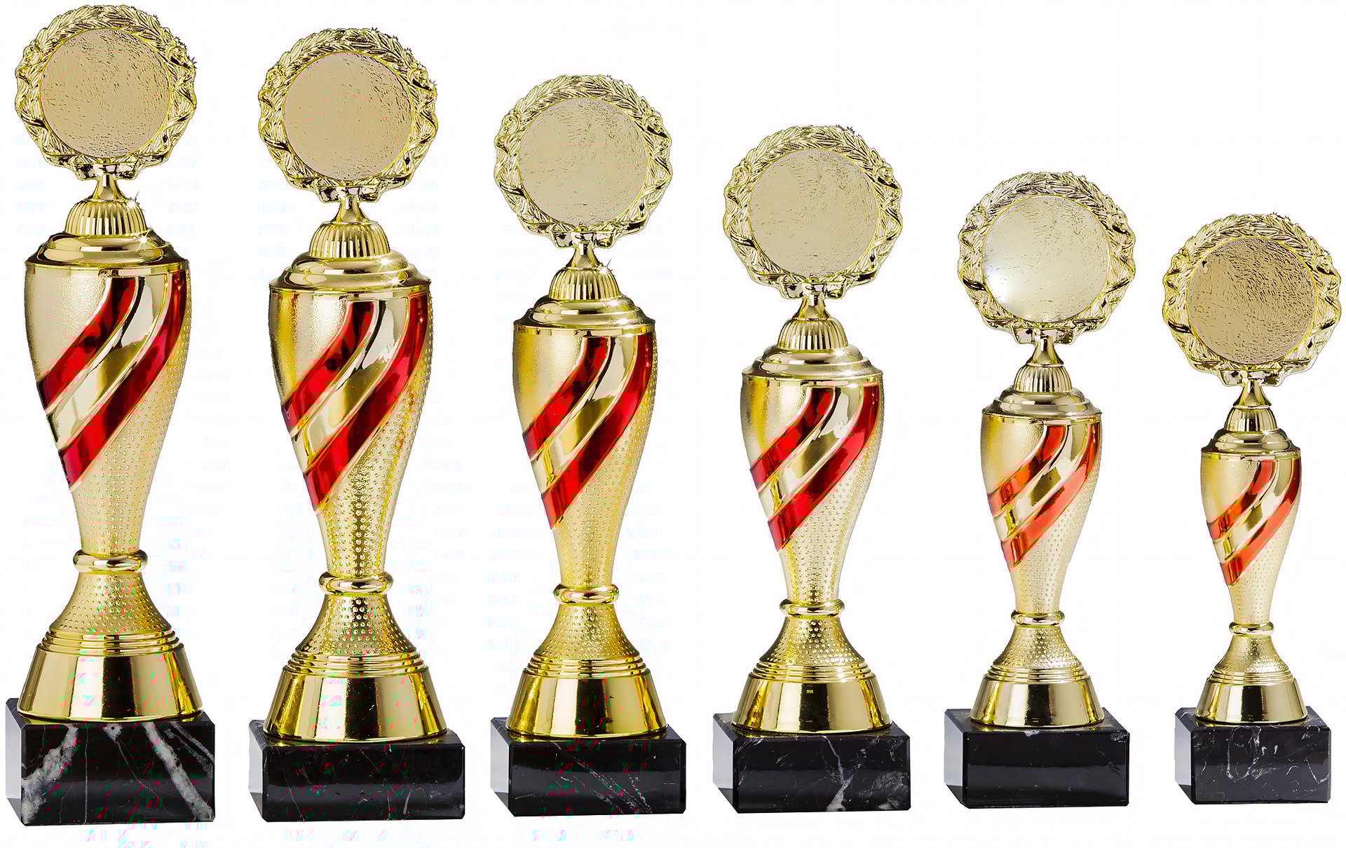 Pokal in Gold, Rot von 22,9 cm – 31,5 cm Höhe in Standard Qualität. Individuelle Sockelbeschriftung auf Gravurplatte. Emblem in 50 mm Durchmesser wählbar aus über 300 Designs oder einem eigenen Emblem. Dieser Pokal ist universell für jede Zielgruppe/Sportart einsetzbar. Als 6er-Serie erhältlich.