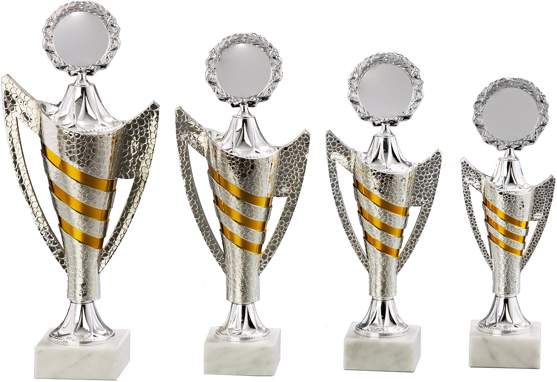 Pokal in Silber, Gold von 26,5 cm – 34,1 cm Höhe in Standard Qualität. Individuelle Sockelbeschriftung auf Gravurplatte. Emblem in 50 mm Durchmesser wählbar aus über 300 Designs oder einem eigenen Emblem. Dieser Pokal ist universell für jede Zielgruppe/Sportart einsetzbar. Als 4er-Serie erhältlich.