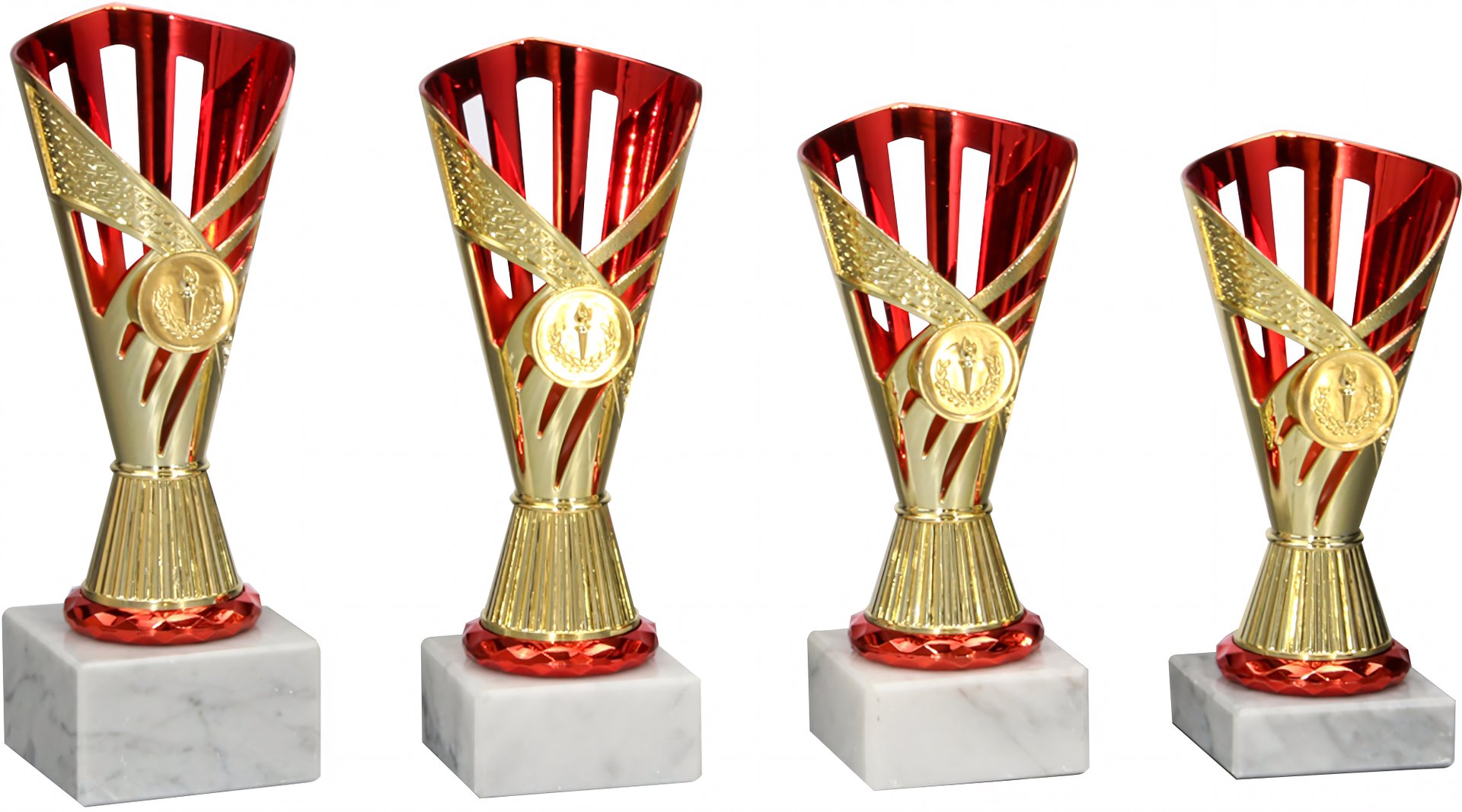 Pokal in Gold, Rot von 16,7 cm – 20,8 cm Höhe in Standard Qualität. Individuelle Sockelbeschriftung auf Gravurplatte. Emblem in 25 mm Durchmesser wählbar aus über 300 Designs oder einem eigenen Emblem. Dieser Pokal ist universell für jede Zielgruppe/Sportart einsetzbar. Als 4er-Serie erhältlich.