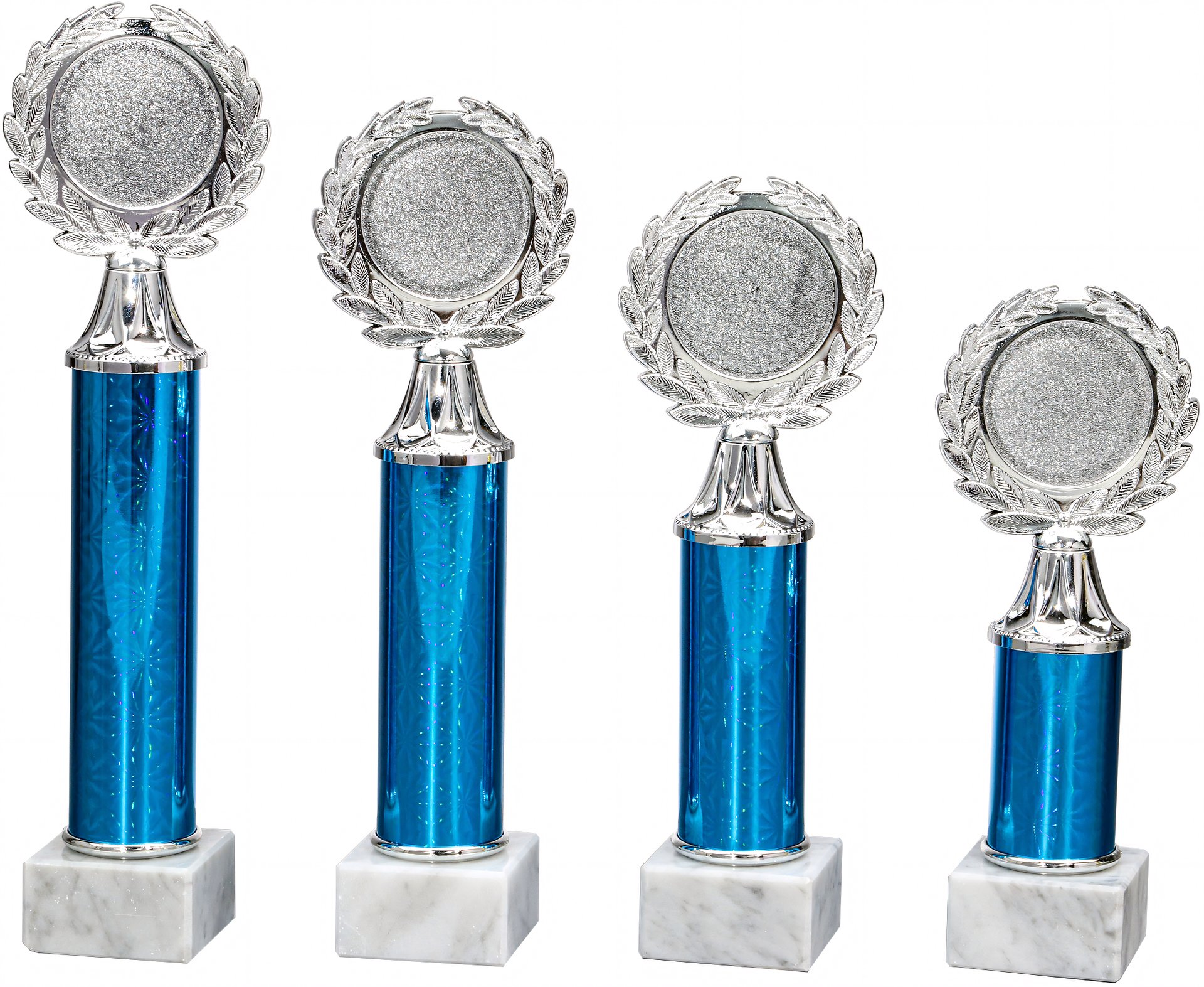 Pokal in Blau, Silber von 21,3 cm – 29,4 cm Höhe in Standard Qualität. Individuelle Sockelbeschriftung auf Gravurplatte. Emblem in 50 mm Durchmesser wählbar aus über 300 Designs oder einem eigenen Emblem. Dieser Pokal ist universell für jede Zielgruppe/Sportart einsetzbar. Als 4er-Serie erhältlich.