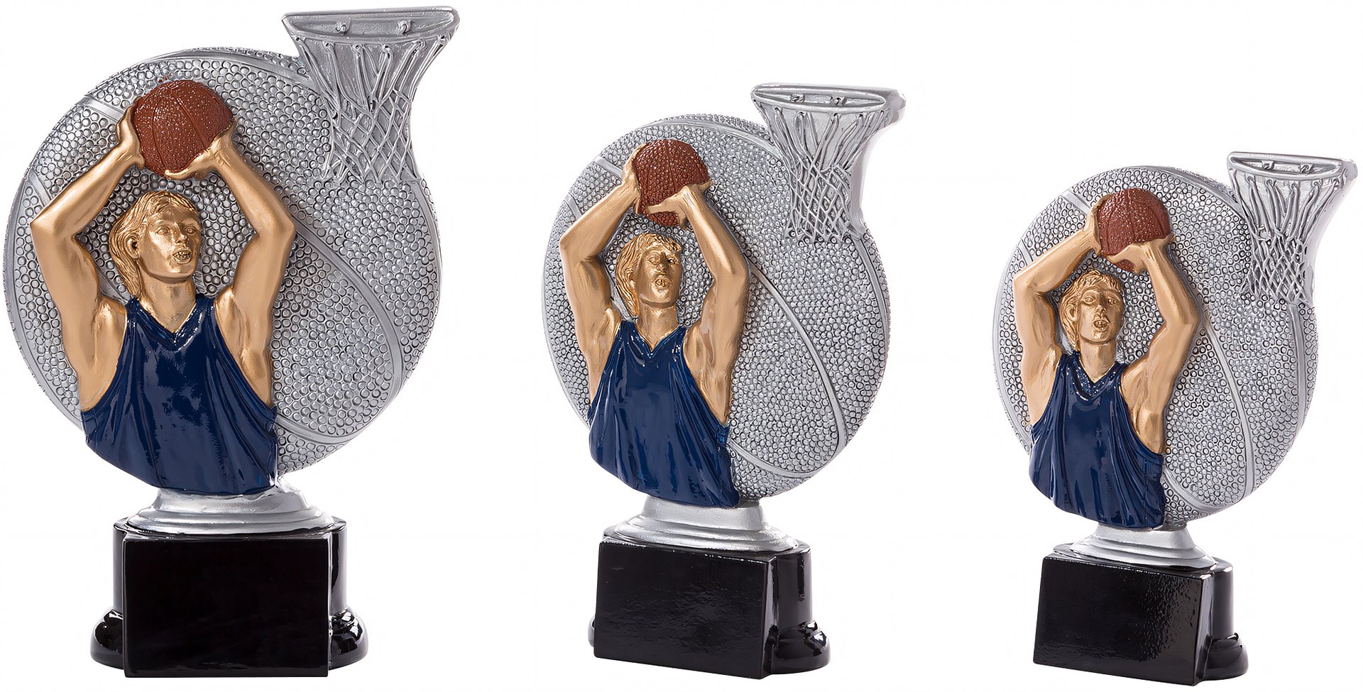 Trophäe in Blau, Grau von 16 cm – 20 cm Höhe. Individuelle Sockelbeschriftung auf Gravurplatte. Diese Trophäe ist speziell für folgende Zielgruppe/Sportart: Basketball. Als 3er-Serie erhältlich.