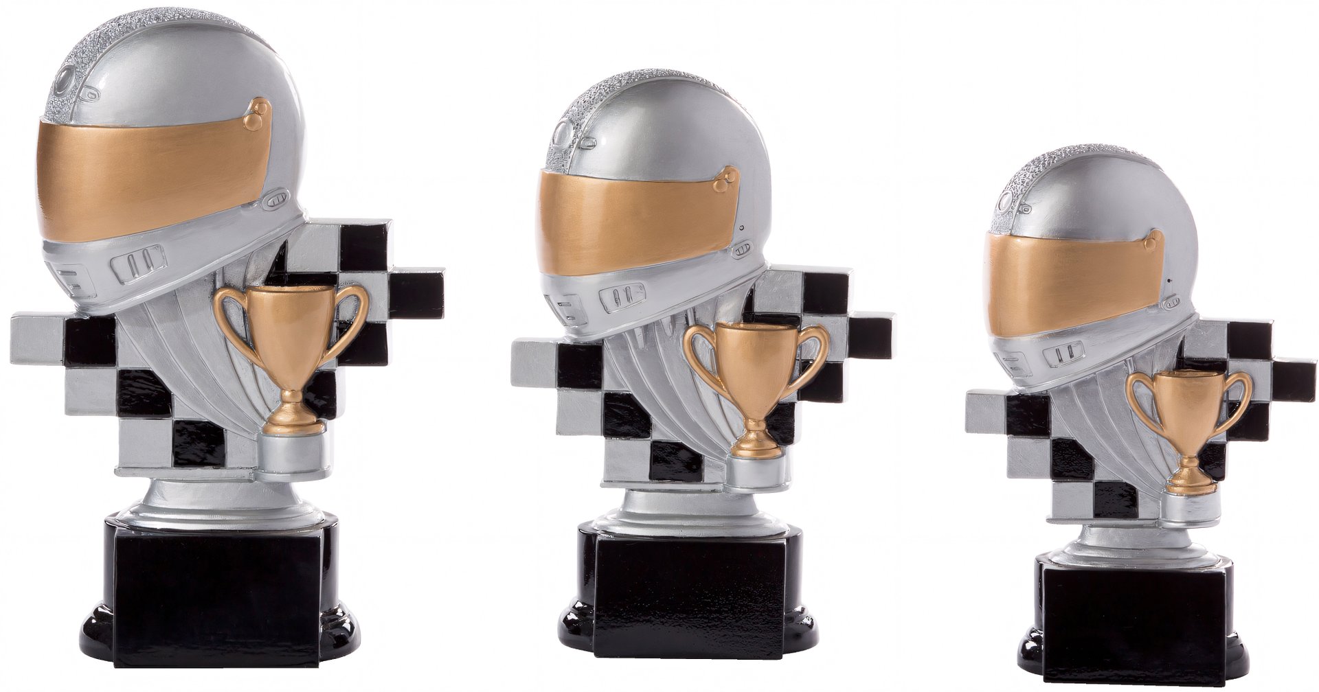 Trophäe in Grau von 16 cm – 20 cm Höhe. Individuelle Sockelbeschriftung auf Gravurplatte. Diese Trophäe ist speziell für folgende Zielgruppe/Sportart: Motorsport. Als 3er-Serie erhältlich.