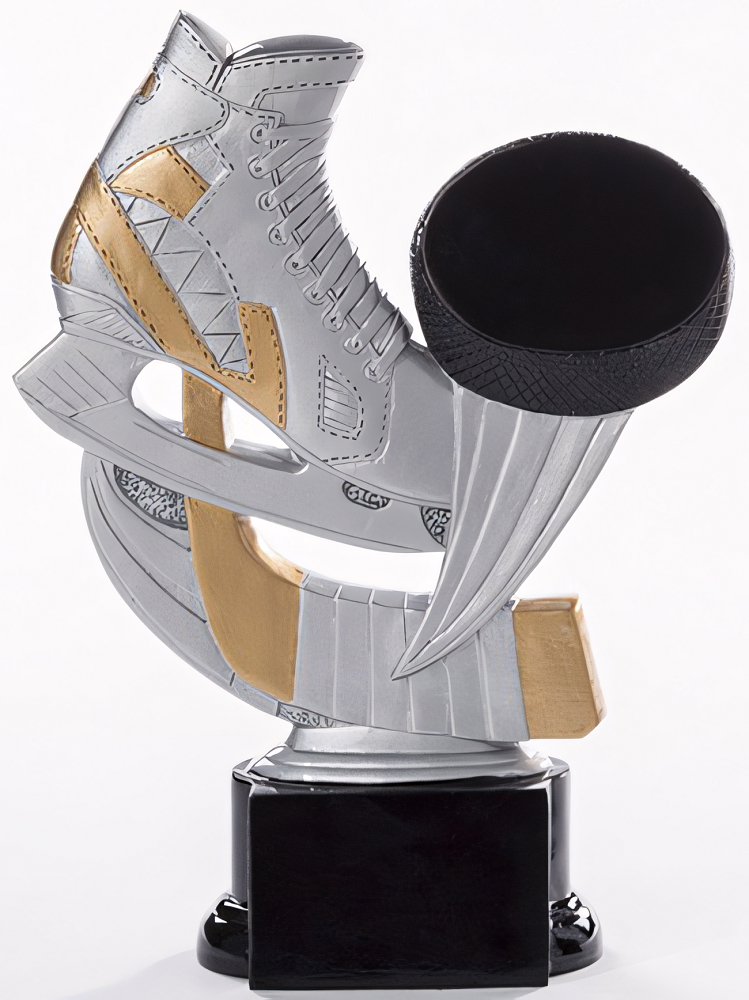 Trophäe in Grau, Gold von 16 cm – 20 cm Höhe. Individuelle Sockelbeschriftung auf Gravurplatte. Diese Trophäe ist speziell für folgende Zielgruppe/Sportart: Eishockey. Als 3er-Serie erhältlich.