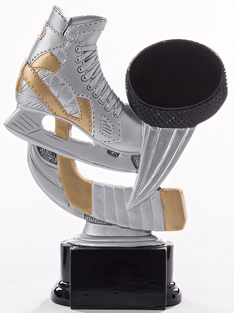 Trophäe in Grau, Gold von 16 cm – 20 cm Höhe. Individuelle Sockelbeschriftung auf Gravurplatte. Diese Trophäe ist speziell für folgende Zielgruppe/Sportart: Eishockey. Als 3er-Serie erhältlich.