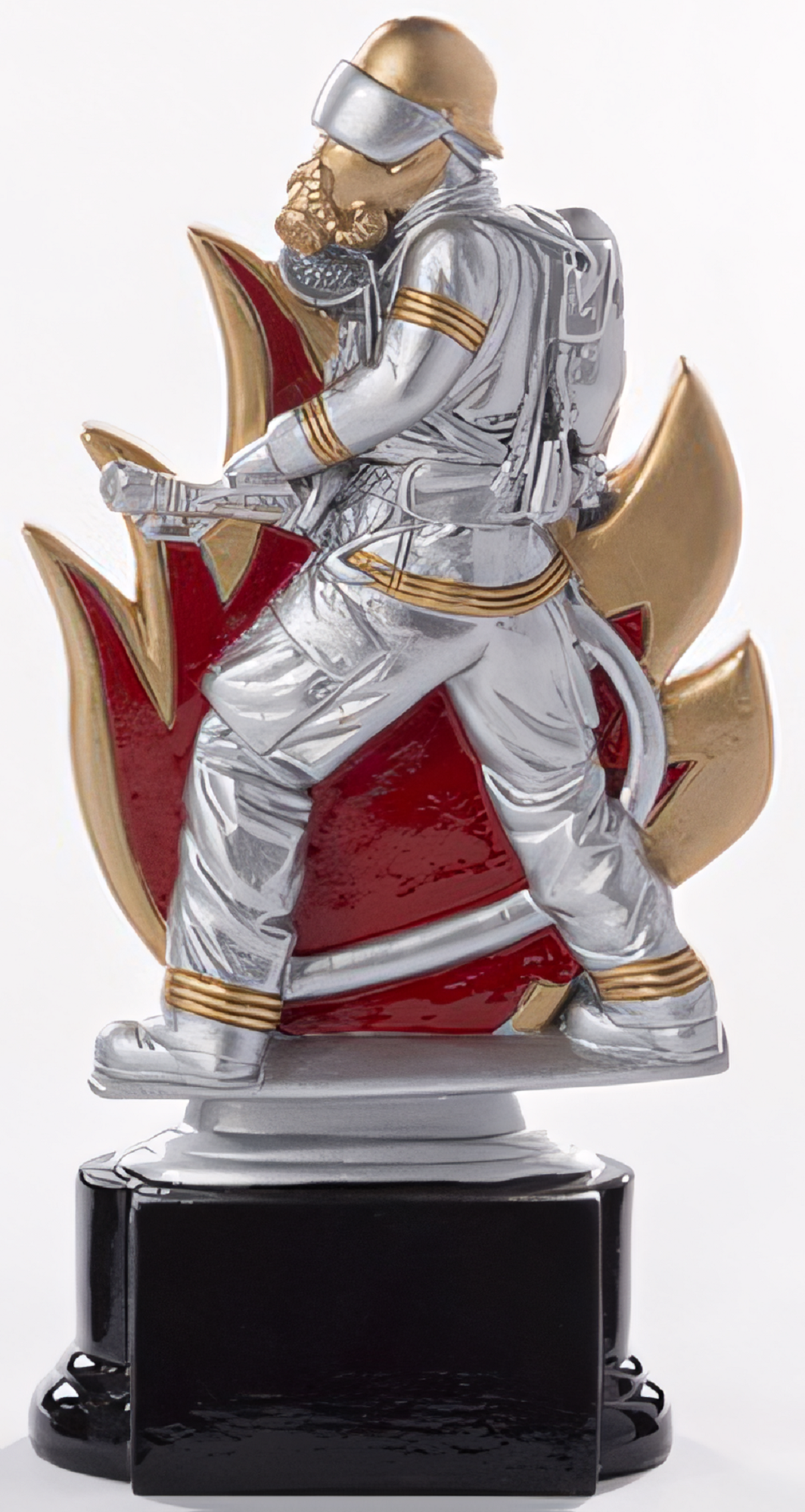 Trophäe in Grau, Gold, Rot von 16 cm – 20 cm Höhe. Individuelle Sockelbeschriftung auf Gravurplatte. Diese Trophäe ist speziell für folgende Zielgruppe/Sportart: Feuerwehr. Als 3er-Serie erhältlich.