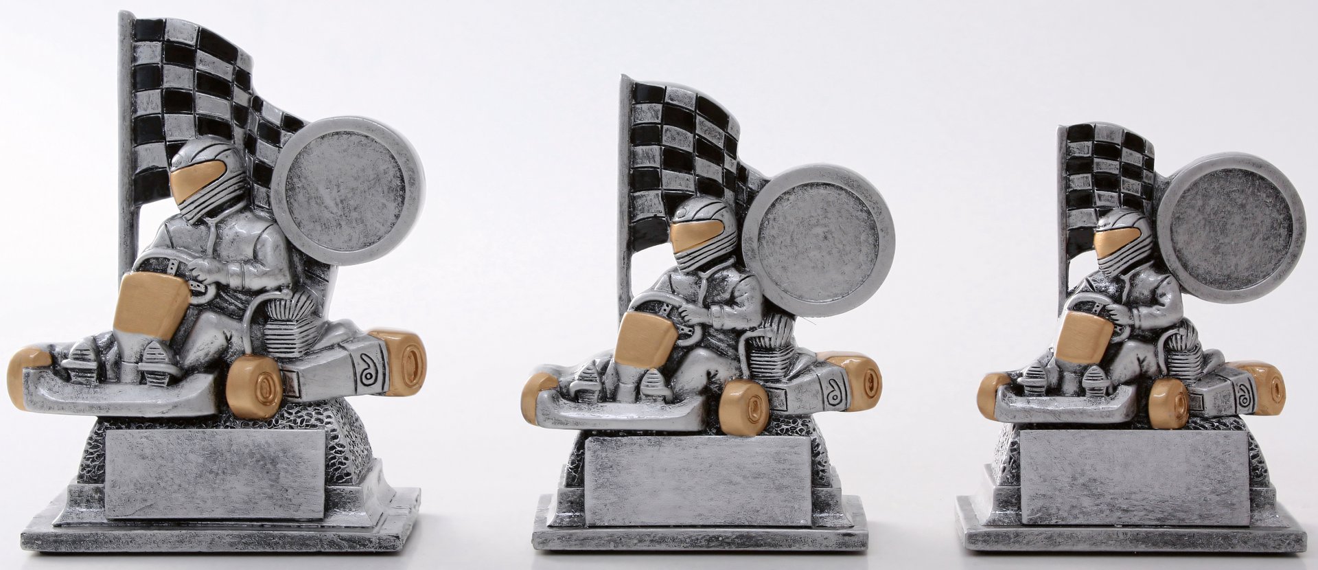 Trophäe in Silber, Gold von 10,7 cm – 9,6 cm Höhe. Individuelle Sockelbeschriftung auf Gravurplatte. Diese Trophäe ist speziell für folgende Zielgruppe/Sportart: Kart. Als 3er-Serie erhältlich.
