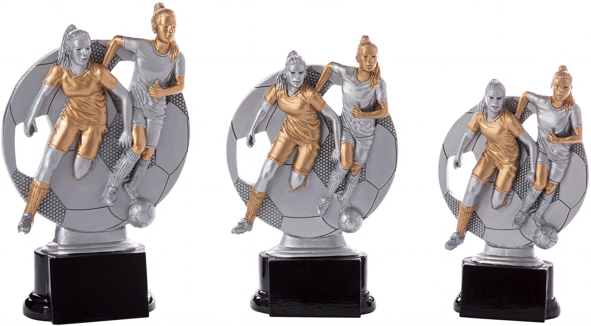 Trophäe in Grau, Gold von 16 cm – 20 cm Höhe. Individuelle Sockelbeschriftung auf Gravurplatte. Diese Trophäe ist speziell für folgende Zielgruppe/Sportart: Fußball. Als 3er-Serie erhältlich.