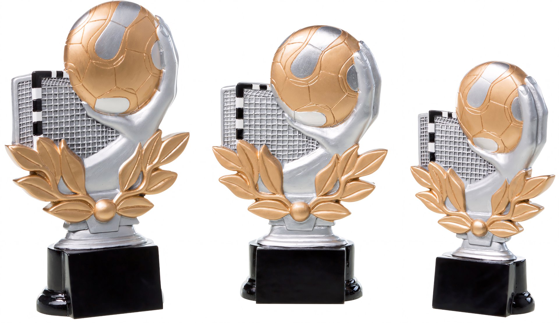 Trophäe in Grau, Gold von 16 cm – 20 cm Höhe. Individuelle Sockelbeschriftung auf Gravurplatte. Diese Trophäe ist speziell für folgende Zielgruppe/Sportart: Handball. Als 3er-Serie erhältlich.