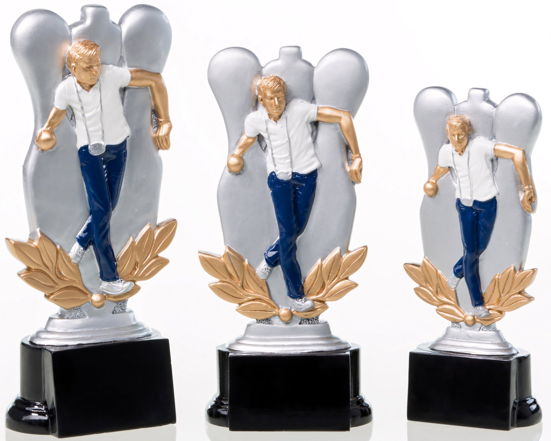 Trophäe in Grau, Gold von 16 cm – 20 cm Höhe. Individuelle Sockelbeschriftung auf Gravurplatte. Diese Trophäe ist speziell für folgende Zielgruppen/Sportarten: Kegeln, Kegeln. Als 3er-Serie erhältlich.