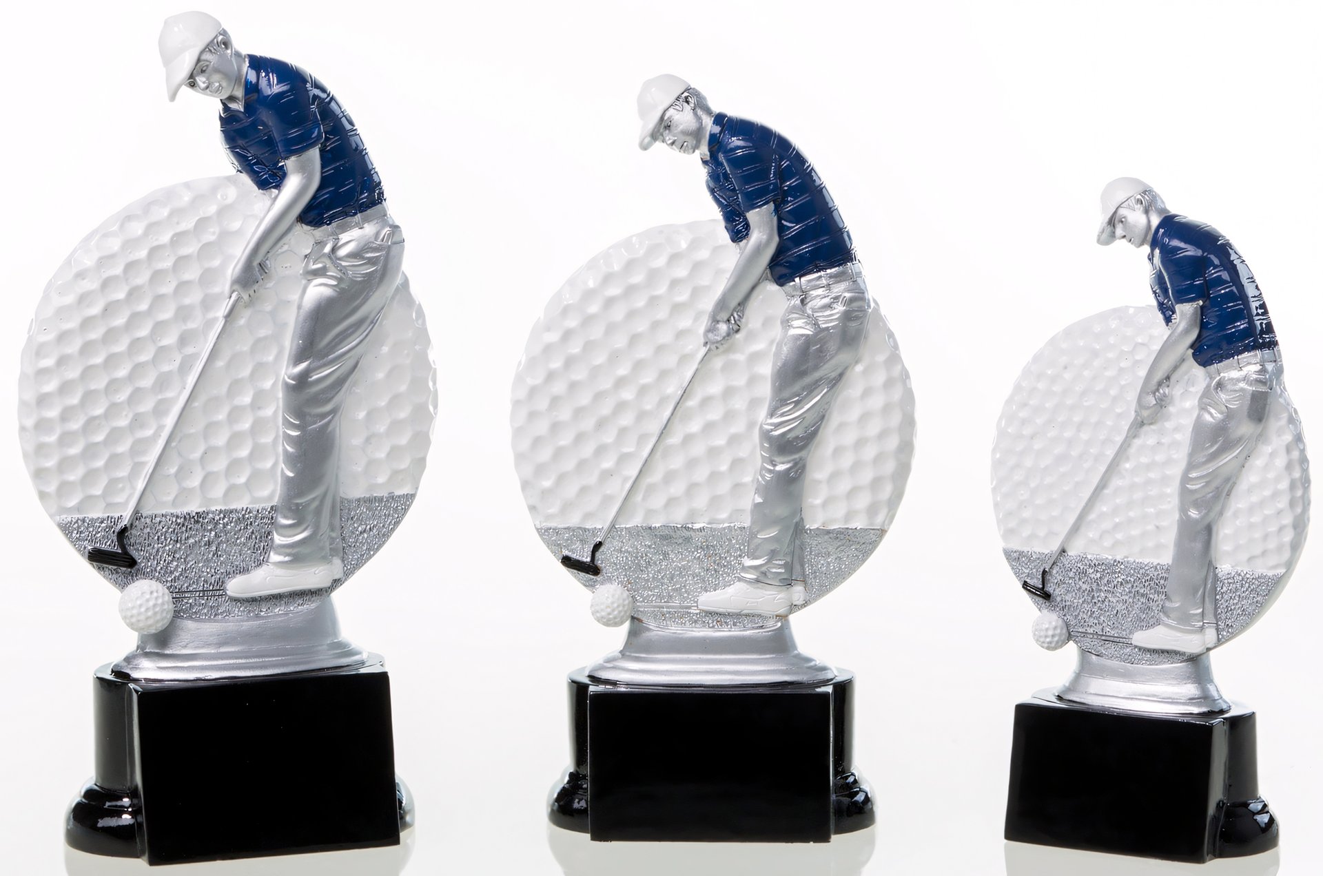Trophäe in Grau, Blau von 16 cm – 20 cm Höhe. Individuelle Sockelbeschriftung auf Gravurplatte. Diese Trophäe ist speziell für folgende Zielgruppe/Sportart: Golf. Als 3er-Serie erhältlich.