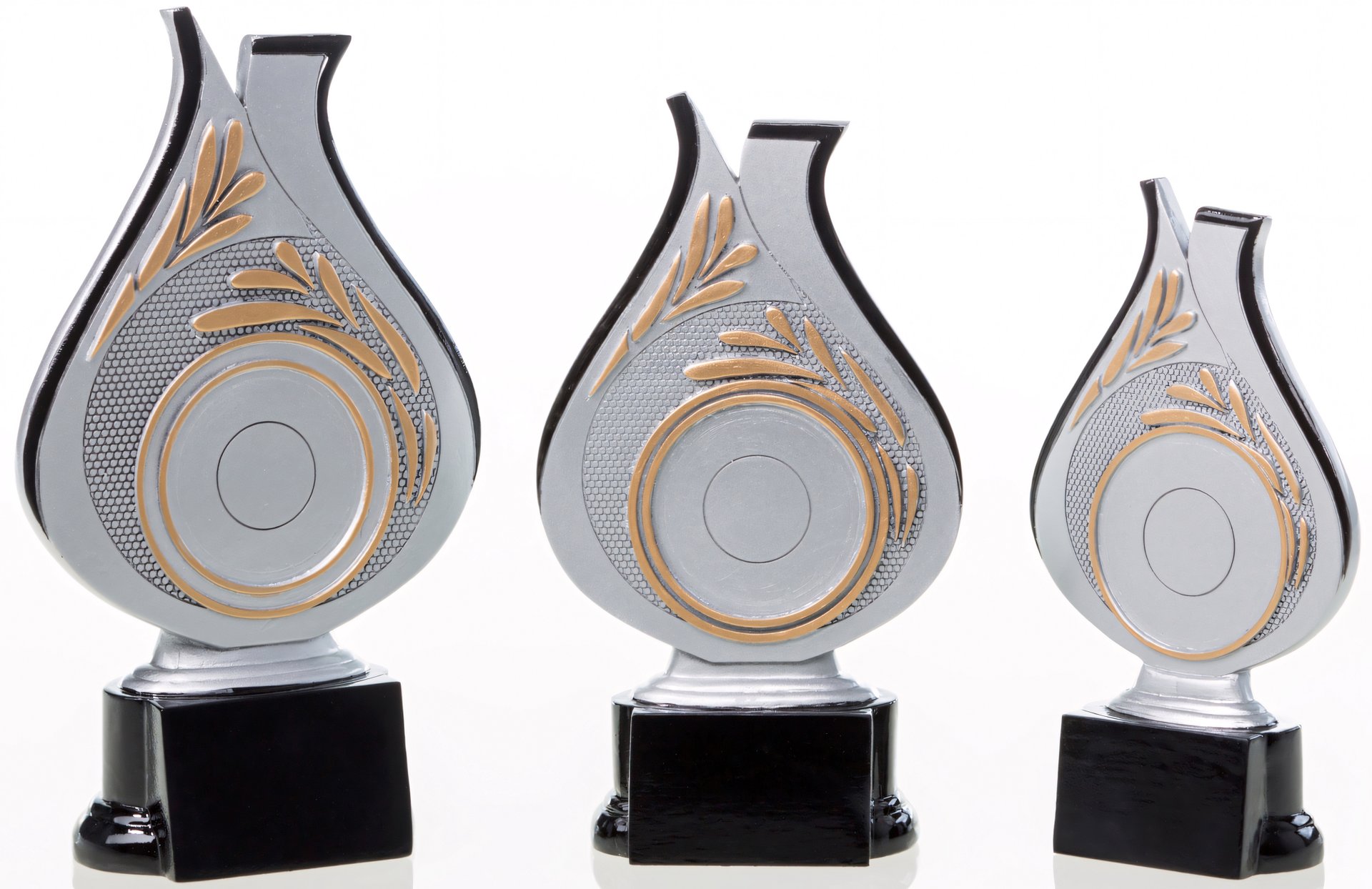 Trophäe in Gold, Silber von 16 cm – 20 cm Höhe. Individuelle Sockelbeschriftung auf Gravurplatte. Emblem in 50 mm Durchmesser wählbar aus über 300 Designs oder einem eigenen Emblem. Diese Trophäe ist universell für jede Zielgruppe/Sportart einsetzbar. Als 3er-Serie erhältlich.