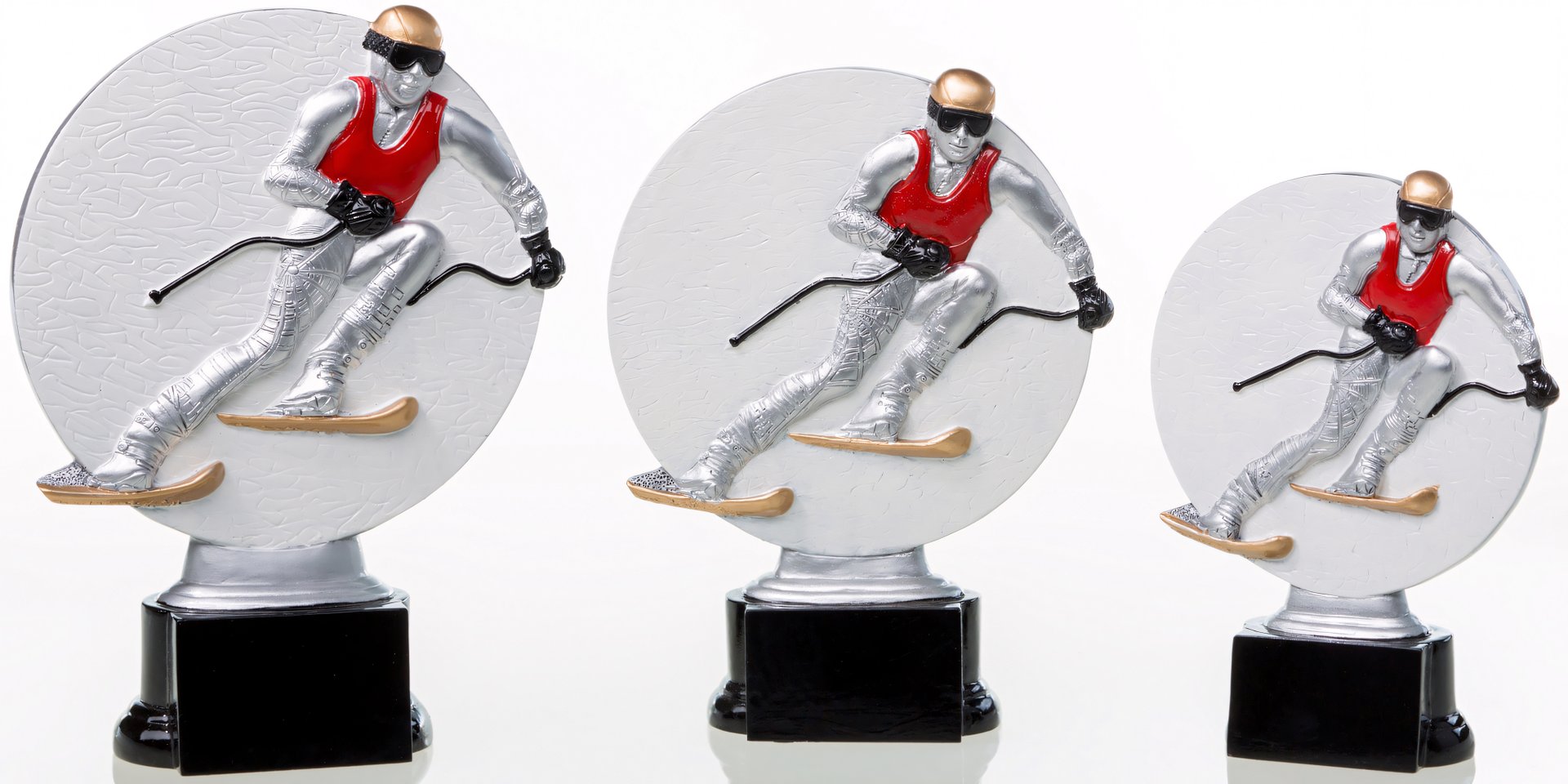 Trophäe in Silber, Gold, Rot von 16 cm – 20 cm Höhe. Individuelle Sockelbeschriftung auf Gravurplatte. Diese Trophäe ist speziell für folgende Zielgruppe/Sportart: Wintersport. Als 3er-Serie erhältlich.