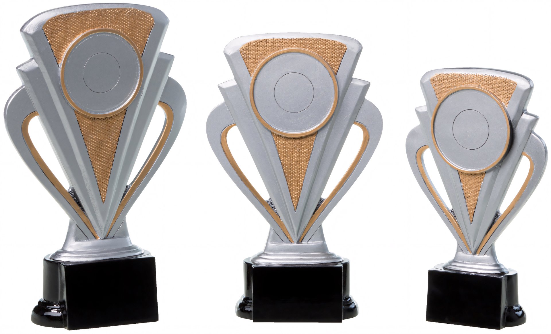 Trophäe in Silber, Gold von 16 cm – 20 cm Höhe. Individuelle Sockelbeschriftung auf Gravurplatte. Emblem in 50 mm Durchmesser wählbar aus über 300 Designs oder einem eigenen Emblem. Diese Trophäe ist universell für jede Zielgruppe/Sportart einsetzbar. Als 3er-Serie erhältlich.