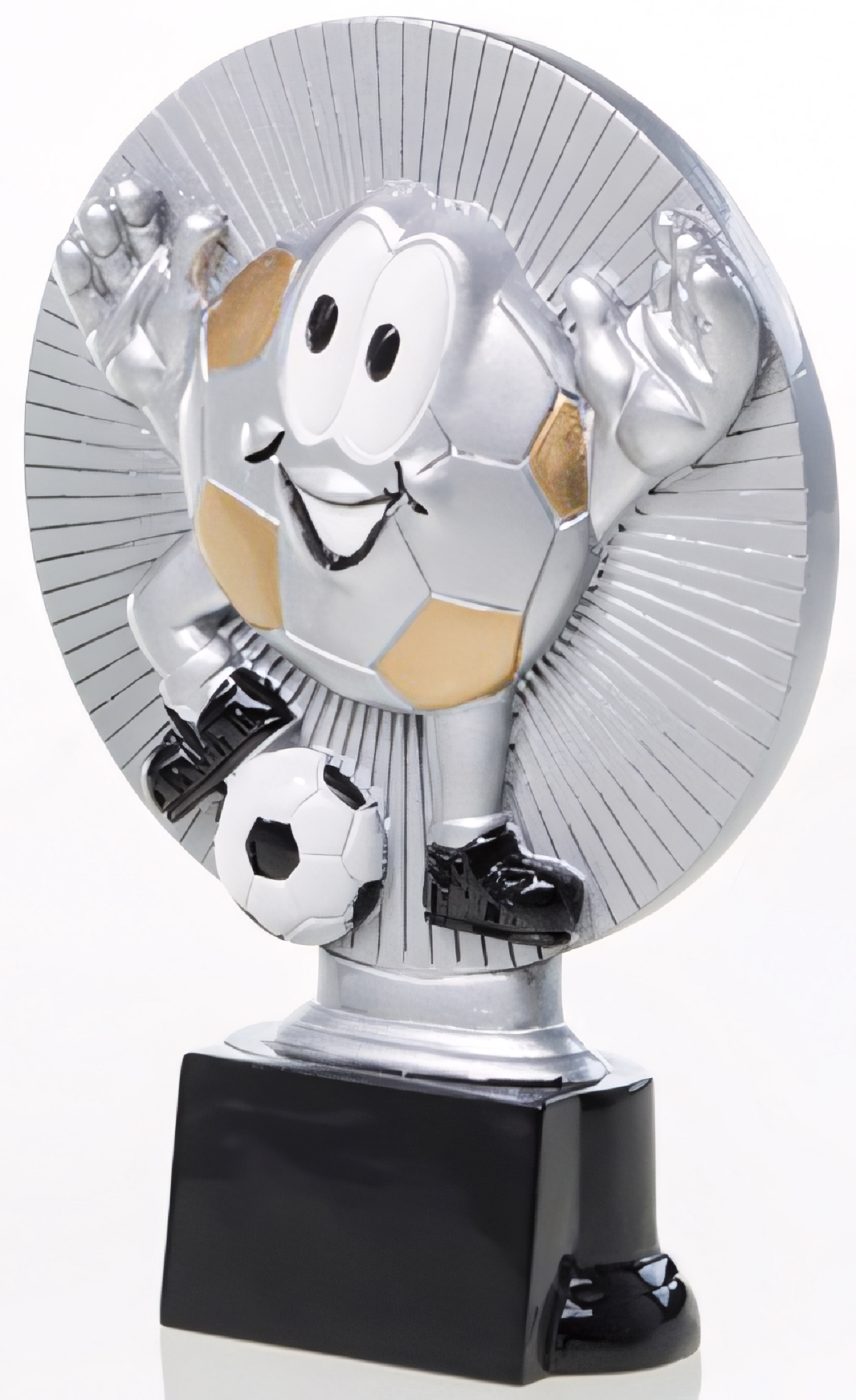 Trophäe in Silber, Gold von 16 cm – 20 cm Höhe. Individuelle Sockelbeschriftung auf Gravurplatte. Diese Trophäe ist speziell für folgende Zielgruppe/Sportart: Fußball. Als 3er-Serie erhältlich.