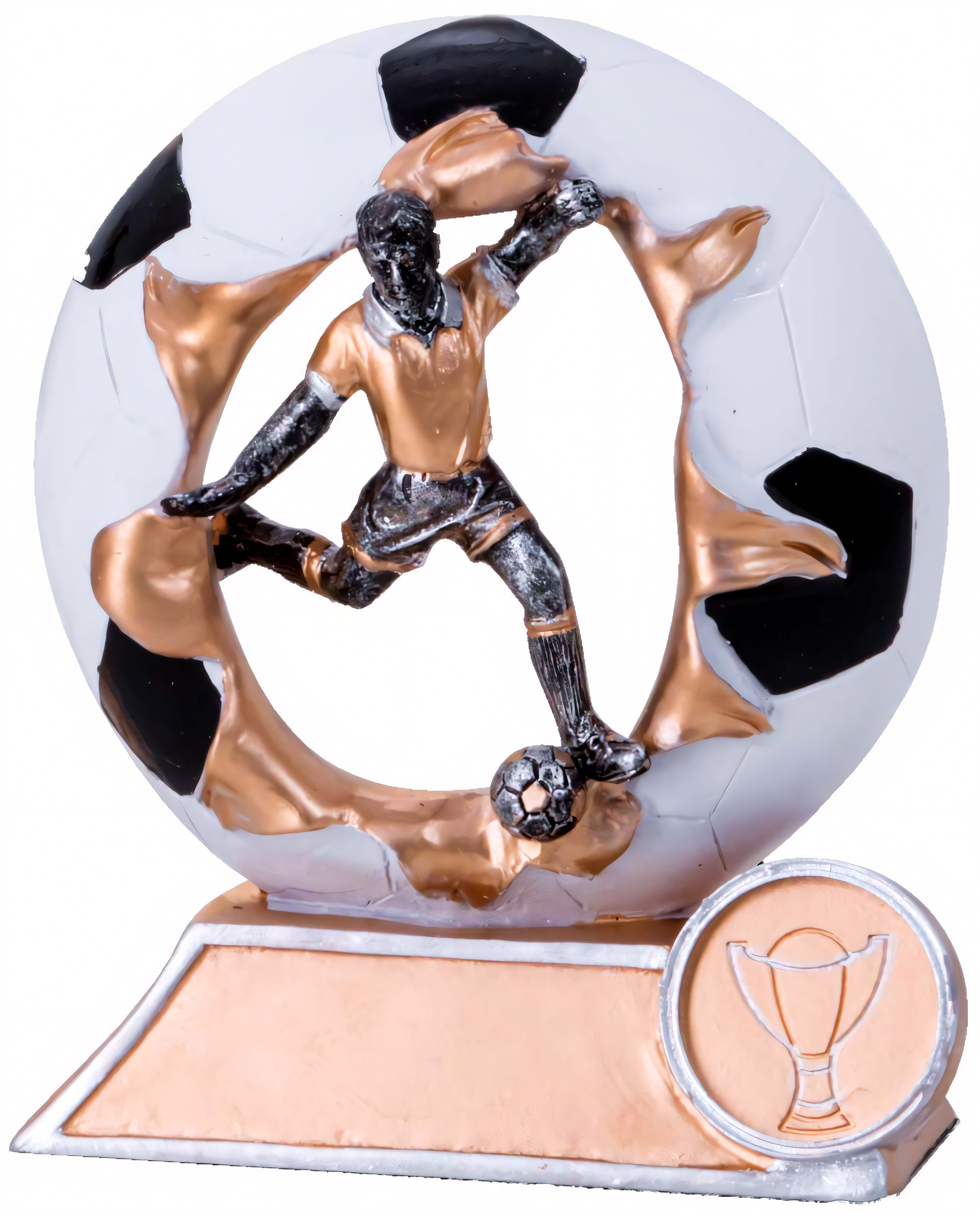 Trophäe in Weiß, Schwarz, Gold mit einer Höhe von 11,7 cm. Individuelle Sockelbeschriftung auf Gravurplatte. Emblem in 25 mm Durchmesser wählbar aus über 300 Designs oder einem eigenen Emblem. Diese Trophäe ist speziell für folgende Zielgruppe/Sportart: Fußball.