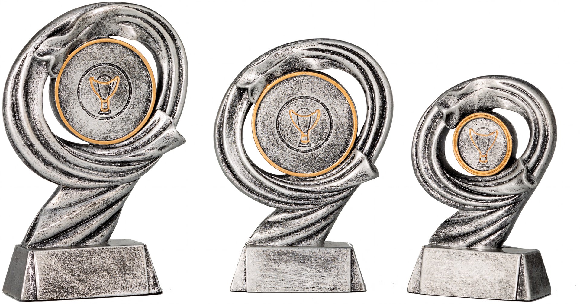 Trophäe in Gold, Silber von 11 cm – 15 cm Höhe. Individuelle Sockelbeschriftung auf Gravurplatte. Emblem in 50 mm Durchmesser wählbar aus über 300 Designs oder einem eigenen Emblem. Diese Trophäe ist universell für jede Zielgruppe/Sportart einsetzbar. Als 3er-Serie erhältlich.