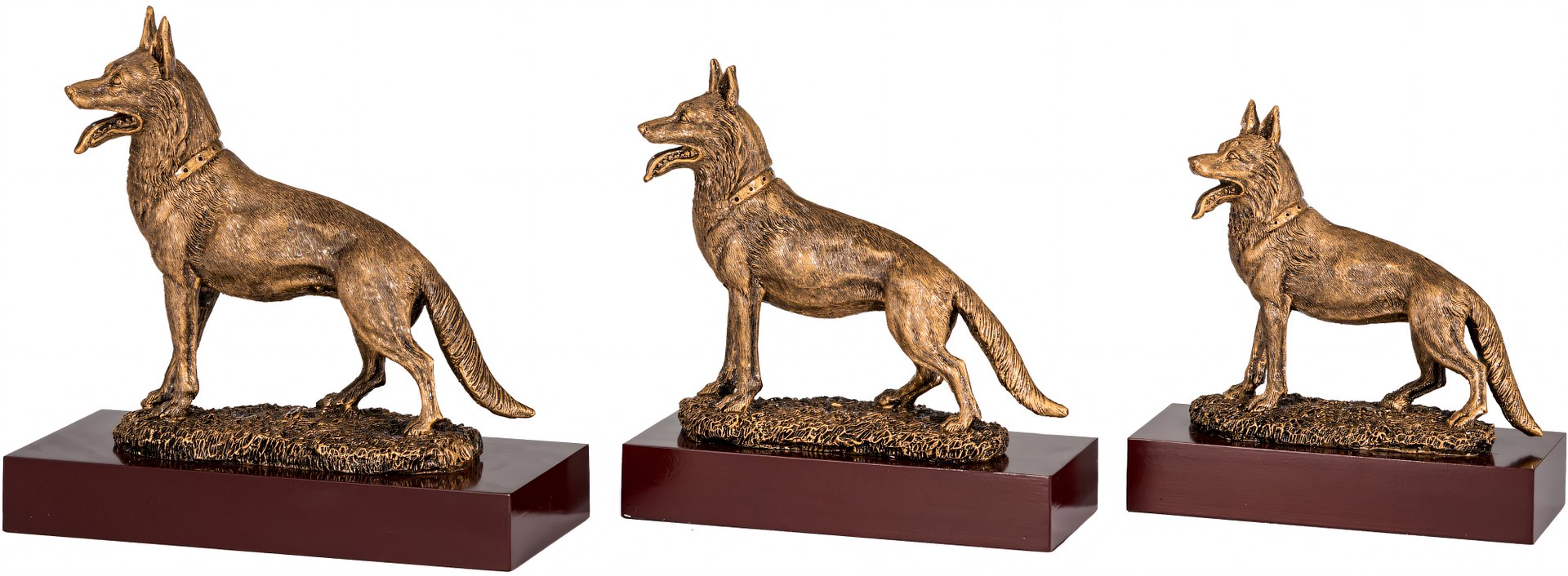 Trophäe in Gold von 17 cm – 21,2 cm Höhe. Individuelle Sockelbeschriftung auf Gravurplatte. Diese Trophäe ist speziell für folgende Zielgruppe/Sportart: Hunde. Als 3er-Serie erhältlich.