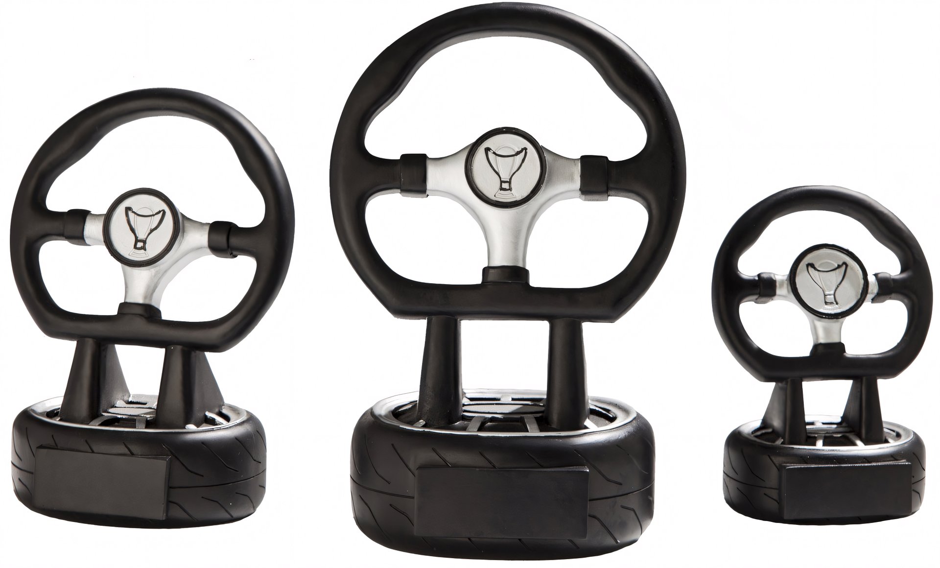 Trophäe in Silber, Schwarz von 12 cm – 20 cm Höhe. Individuelle Sockelbeschriftung auf Gravurplatte. Diese Trophäe ist speziell für folgende Zielgruppe/Sportart: Motorsport. Als 3er-Serie erhältlich.