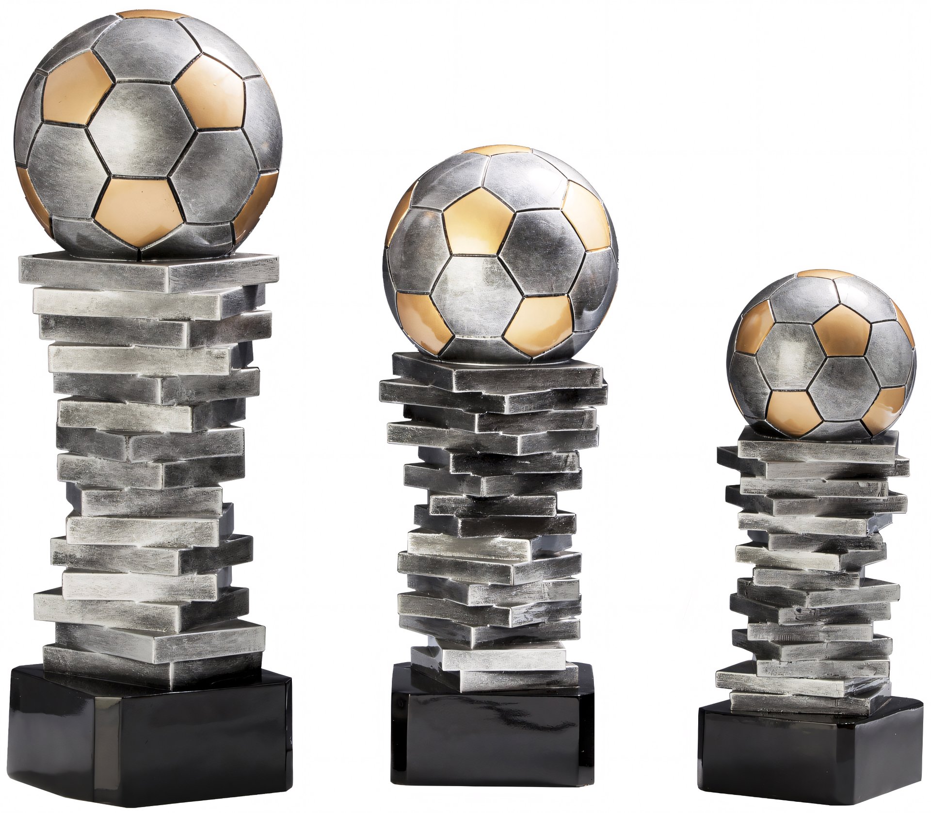 Trophäe in Gold, Silber von 30 cm – 44 cm Höhe. Individuelle Sockelbeschriftung auf Gravurplatte. Diese Trophäe ist speziell für folgende Zielgruppe/Sportart: Fußball. Als 3er-Serie erhältlich.