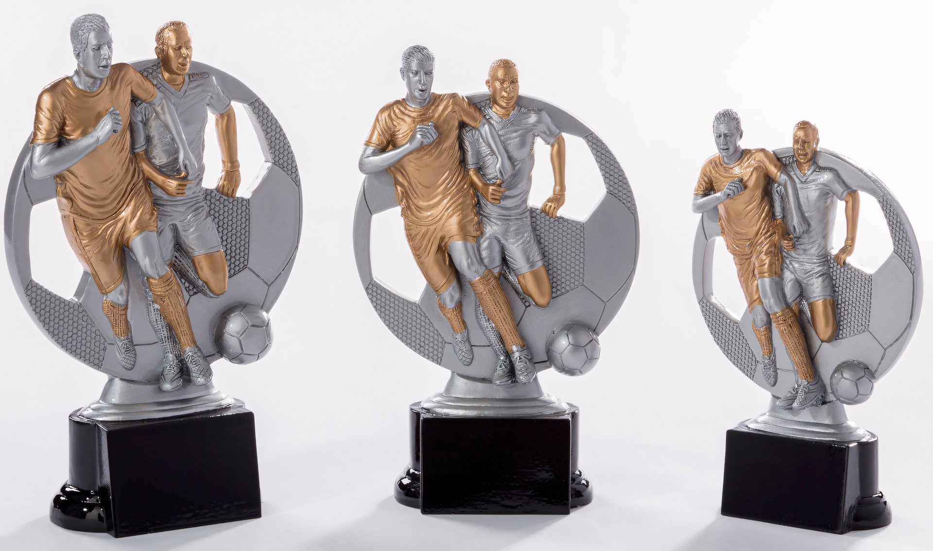 Trophäe in Silber, Gold von 16 cm – 20 cm Höhe. Individuelle Sockelbeschriftung auf Gravurplatte. Diese Trophäe ist speziell für folgende Zielgruppe/Sportart: Fußball. Als 3er-Serie erhältlich.