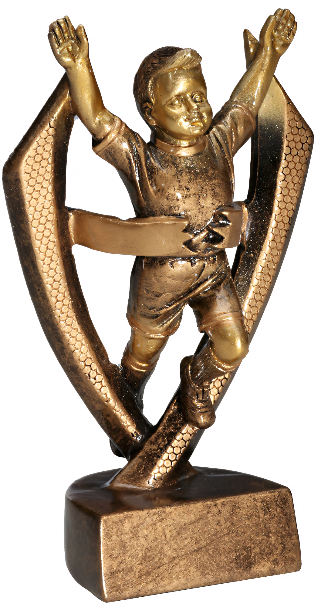 Trophäe in Gold mit einer Höhe von 13,5 cm. Individuelle Sockelbeschriftung auf Gravurplatte. Diese Trophäe ist speziell für folgende Zielgruppe/Sportart: Kinder.