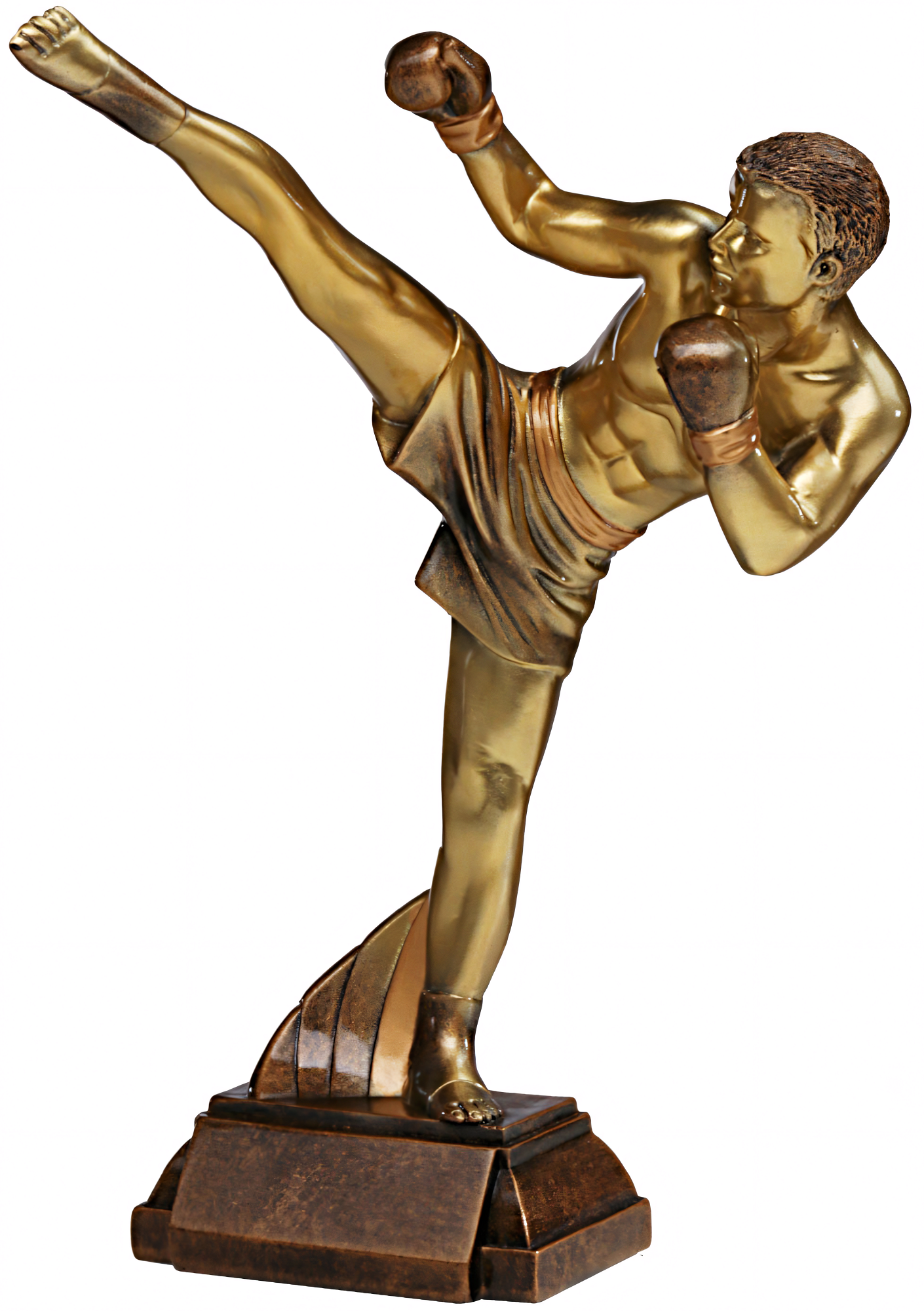 Trophäe in Gold von 29 cm – 38 cm Höhe. Individuelle Sockelbeschriftung auf Gravurplatte. Diese Trophäe ist speziell für folgende Zielgruppe/Sportart: Kampfsport.