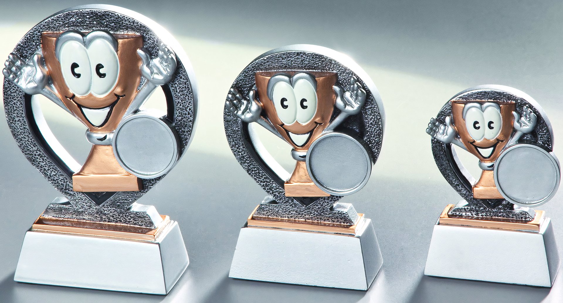 Trophäe in Silber, Gold von 10,7 cm – 8,7 cm Höhe. Individuelle Sockelbeschriftung auf Gravurplatte. Diese Trophäe ist speziell für folgende Zielgruppe/Sportart: Kinder. Als 3er-Serie erhältlich.